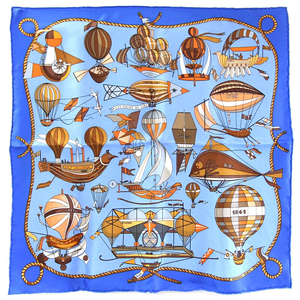 エルメス スカーフ カレ45 LES FOLIES DU CIEL 大空の狂気 ブルー シルク100% 中古 プチカレ ミニ ストール 正方形 レディース