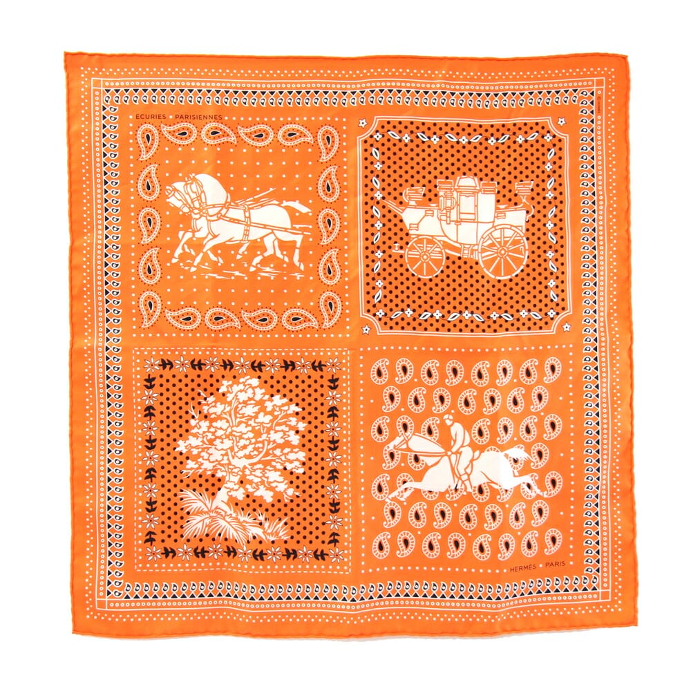 エルメス スカーフ カレ55 ECURIES PARISIENNES パリの厩舎 オレンジ シルク100% 中古 シルクバンダナ ミニストール 正方形 馬 ファッション レディース