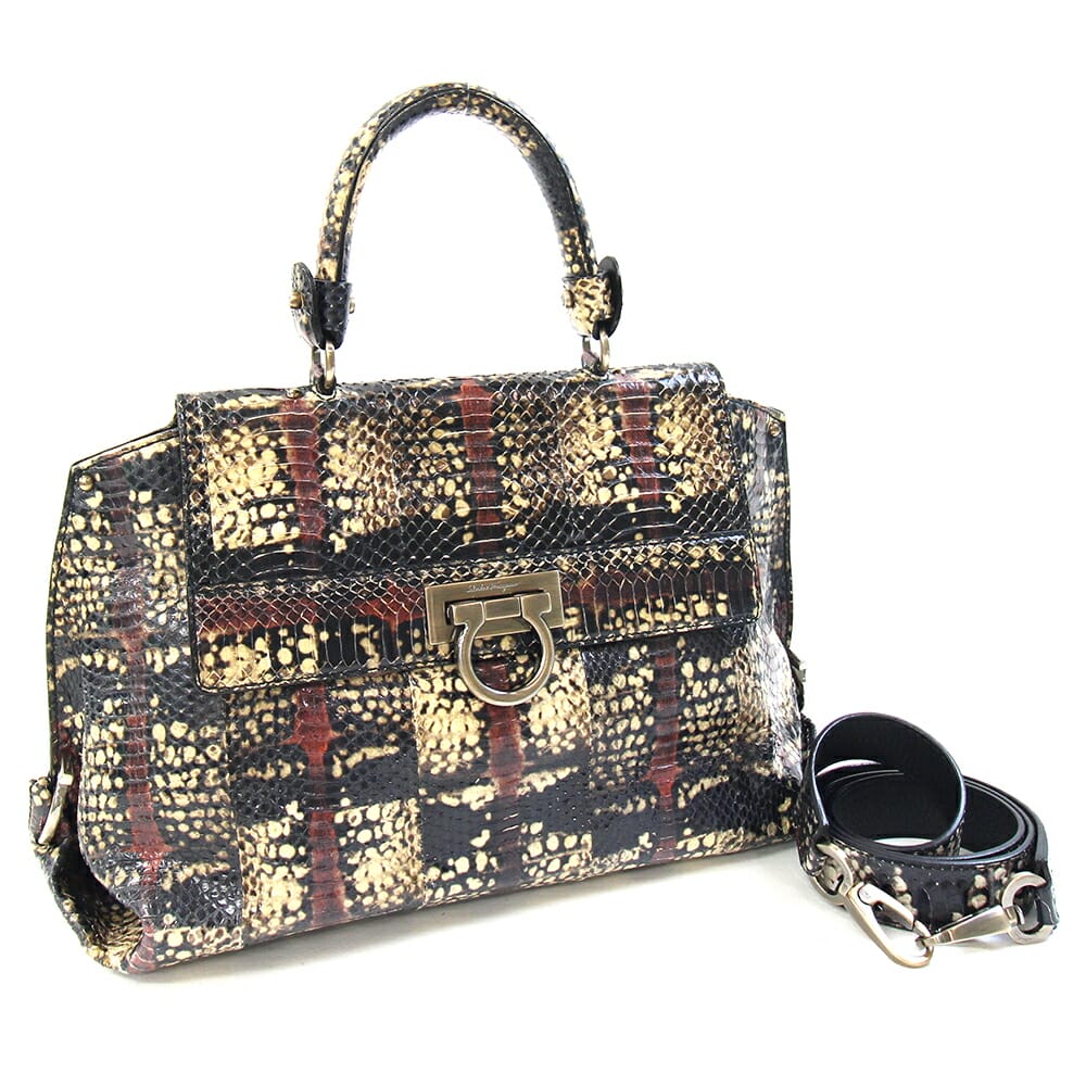 フェラガモ 2WAYハンドバッグ ソフィア 21A967 ベージュ ブラック ボルドー パイソン 中古 ワンハンドル ショルダー 肩掛け エキゾチックレザー 蛇 レディース Salvatore