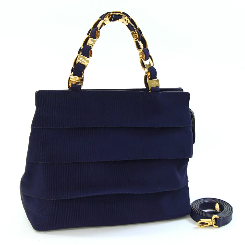 フェラガモ 2WAYハンドバッグ ヴァラ 21 5251 ネイビーブルー ゴールド金具 キャンバス レザー 中古 リボン 鞄 レディース 女性 Salvatore
