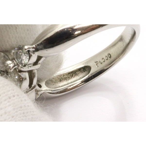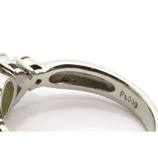 【商品状態】プラチナ部分の内側のへこみ部分に汚れがあります。また微細なキズ、スレがございますが、肉眼で見て気になるほどではございません。 【石の評価】通常の蛍光灯の光でも薄っすらと中央に線が入り、色味はややクリアなライトグリーンです。脇石のダイヤモンドはおおよそSIクラスでややお色味を感じます。 |