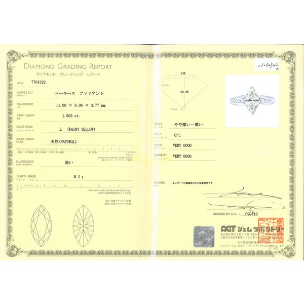1.503/0.21刻印 (マーキースカットダイヤ 1石 1.503ct×メレダイヤ 計0.21ct) |