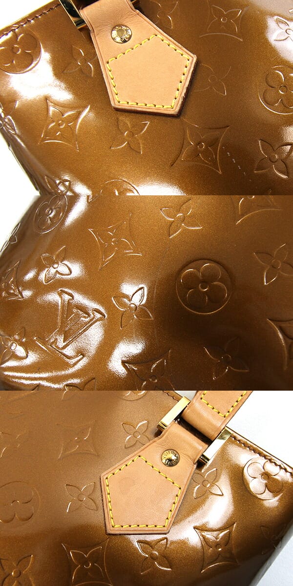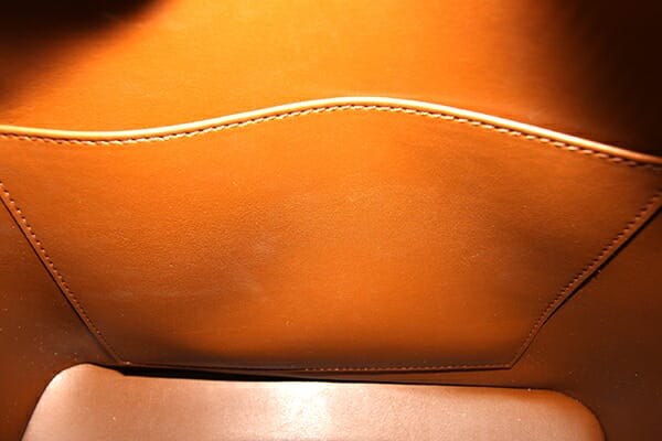 外側:型崩れあり。所々小キズ、黒い色移りあり。ヌメ革にヤケ、シミ、薄汚れ、薄スレあり。底周りにも薄スレあり。 内側:小キズ、薄スレあり。 金具:小キズ、スレ、クスミあり。 |