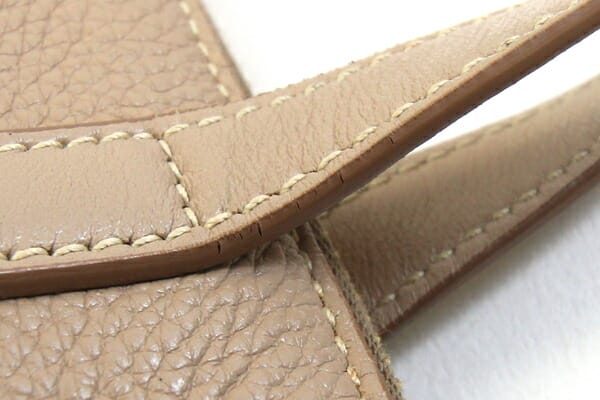 外側:多少型崩れあり、底角にスレ・薄ヨゴレあり。ハンドルのフチ(コバ)に割れあり。ポケットのフチに黒い汚れ、入口のフチ周りに若干薄汚れあり。 内側:薄スレあり。 金具:小キズ、薄スレあり。 |