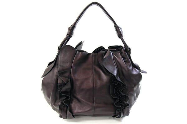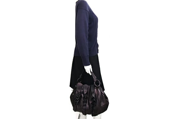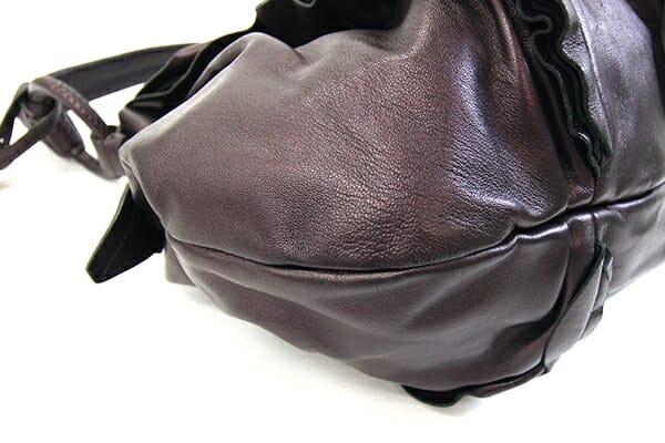 外側:型崩れあり、フリルに乱れあり。所々小キズ、スレあり。底一部や入口周り等にスレによる色褪せあり。 内側:薄スレあり。レザー部分小キズ、スレあり。 金具:小キズ、スレ、クスミあり。 |