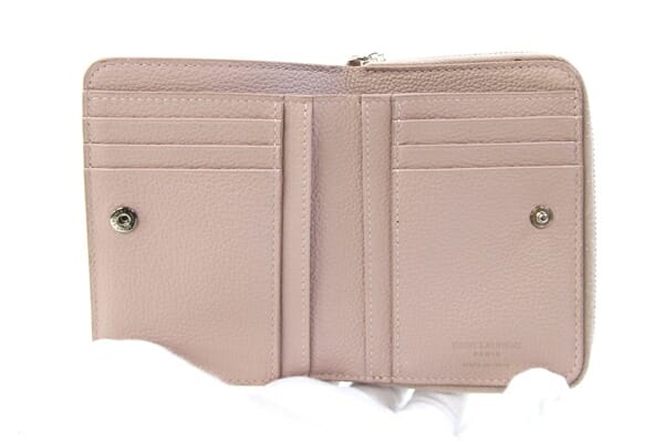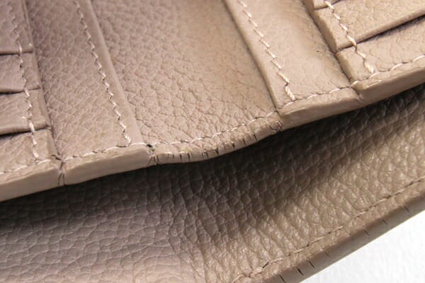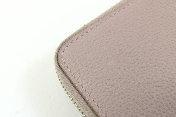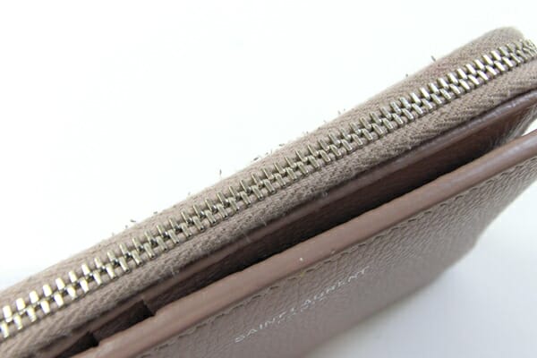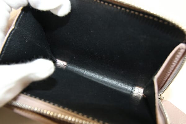 外側:薄スレあり。フチ周りにもスレ、薄汚れ、コーティング割れあり。ファスナー生地に毛羽立ち、薄汚れあり。 内側:所々薄汚れあり。札入れ、ポケット内に薄スレあり。小銭入れにも薄スレ、硬貨汚れあり。 金具:スレ、クスミあり。 |