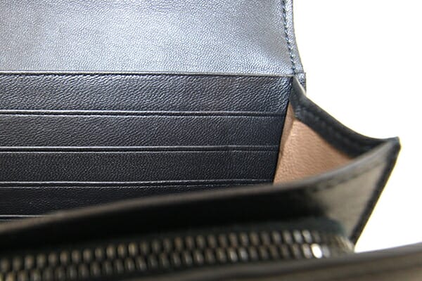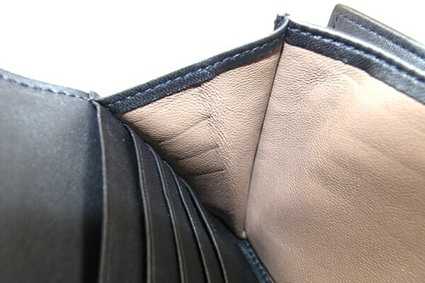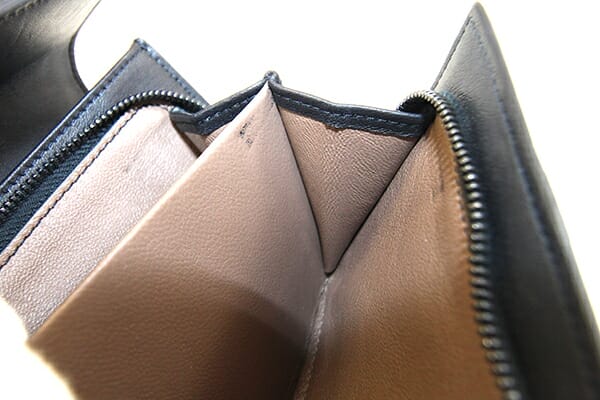 外側:薄キズ、薄スレあり。 内側:フラップ裏、札入れ内に押し跡あり。小銭入れや札入れに所々黒い汚れあり。 金具:微細なキズ、若干クスミあり。 |