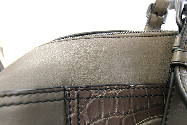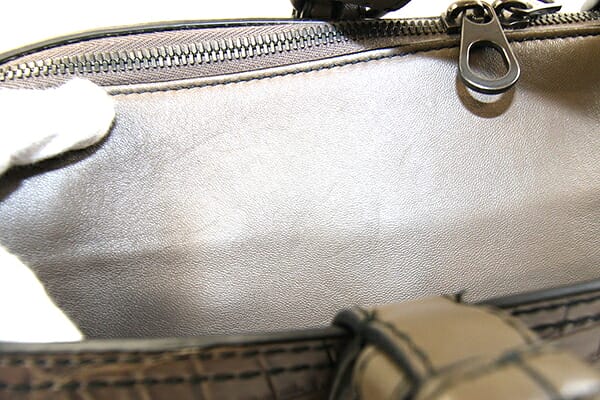 外側:型崩れあり。 所々小キズ・薄汚れあり。底に線状の汚れ、押し跡あり。ハンドルのフチ、底角にスレあり。 内側:キズ・スレ汚れあり、多少若干毛羽立ちあり。 金具:小キズ、スレあり。 |