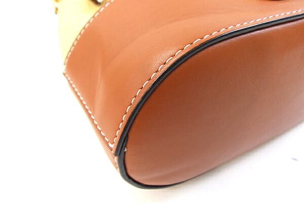 外側:レザーに薄キズ・細かい汚れ、正面下部に型崩れシワあり。入口のフチに薄スレあり。 内側:スレ・薄汚れ、上部周り黄ばみ汚れあり。 金具:小キズ、スレ、クスミあり。 |