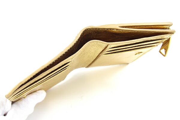 外側:多少型崩れ、所々スレあり。フチ周りに薄汚れ、折り部分にコーティング割れあり。 内側:小キズ・薄スレ・内ポケットに薄汚れあり。 金具:小キズ・スレ・クスミあり。 |