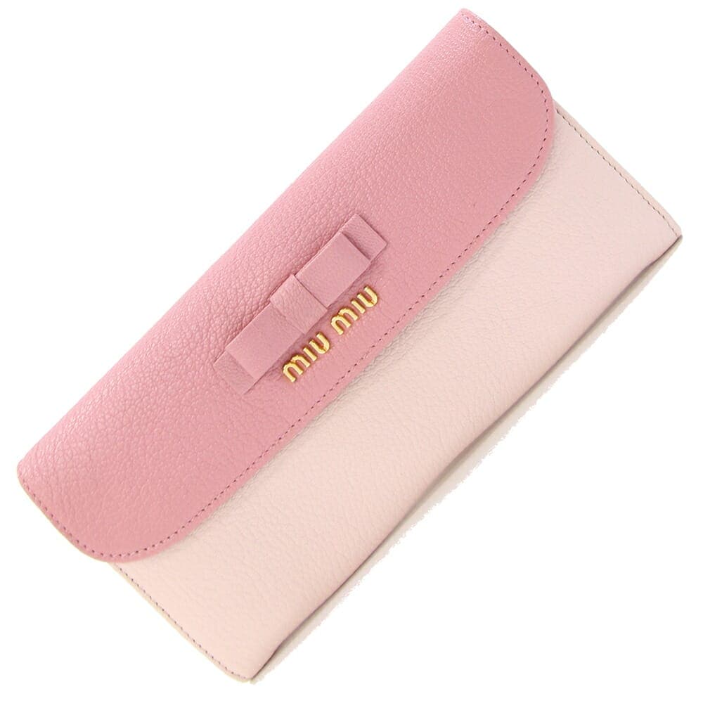 ミュウミュウ 二つ折り長財布 5M1109 ピンク レザー 中古 ロングウォレット バイカラー リボン ロゴ レディース