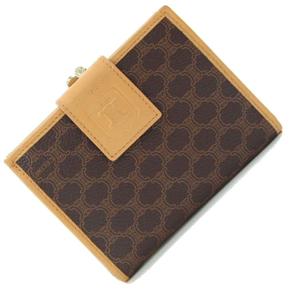 セリーヌ 二つ折りガマ口財布 マカダム ダークブラウン ベージュ PVC レザー 中古 コンパクトウォレット ヴィンテージ オールド レディース