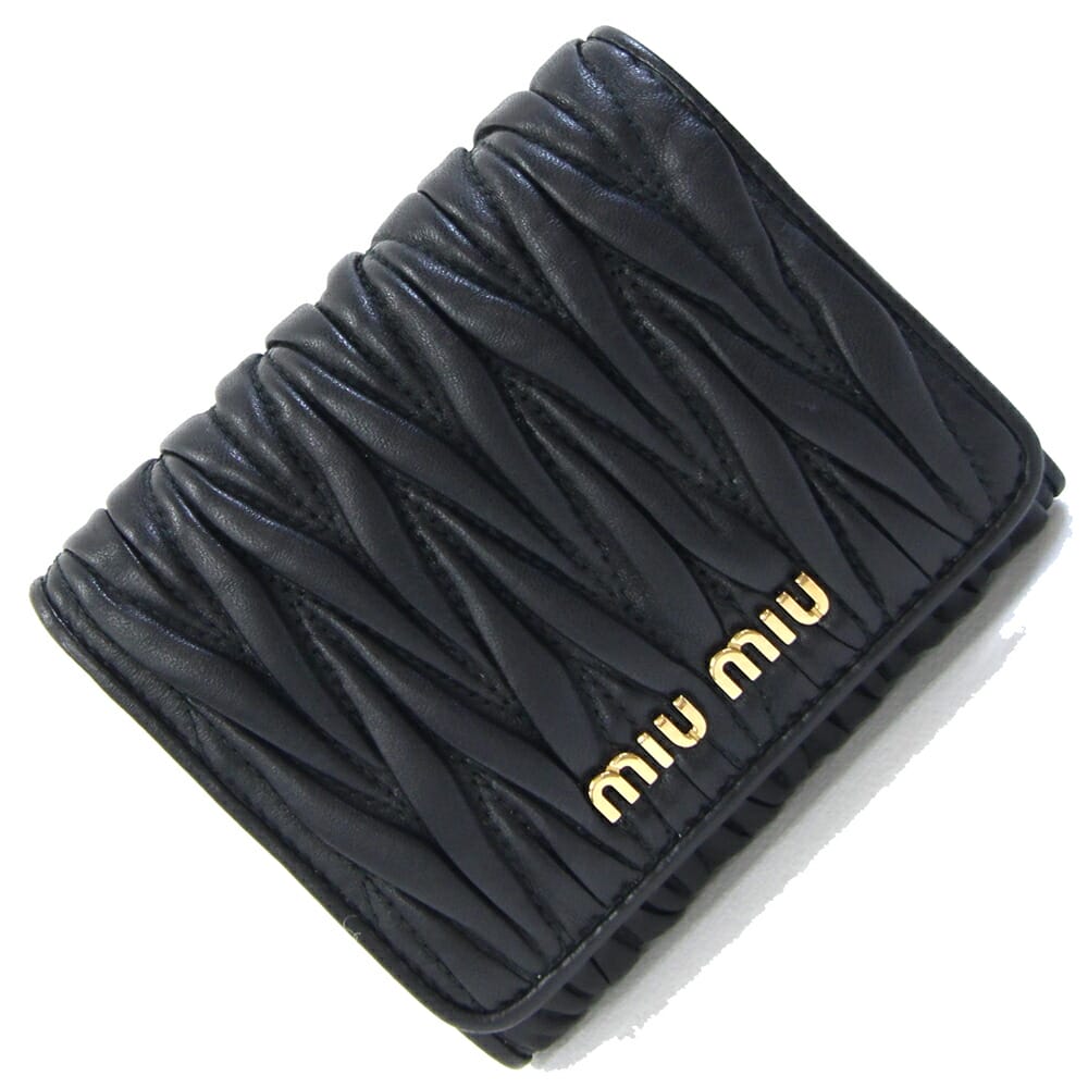 ミュウミュウ 三つ折り財布 マテラッセ 5MH016 ブラック レザー 中古 コンパクトウォレット ミニ財布 ギャザー ロゴ レディース MIU