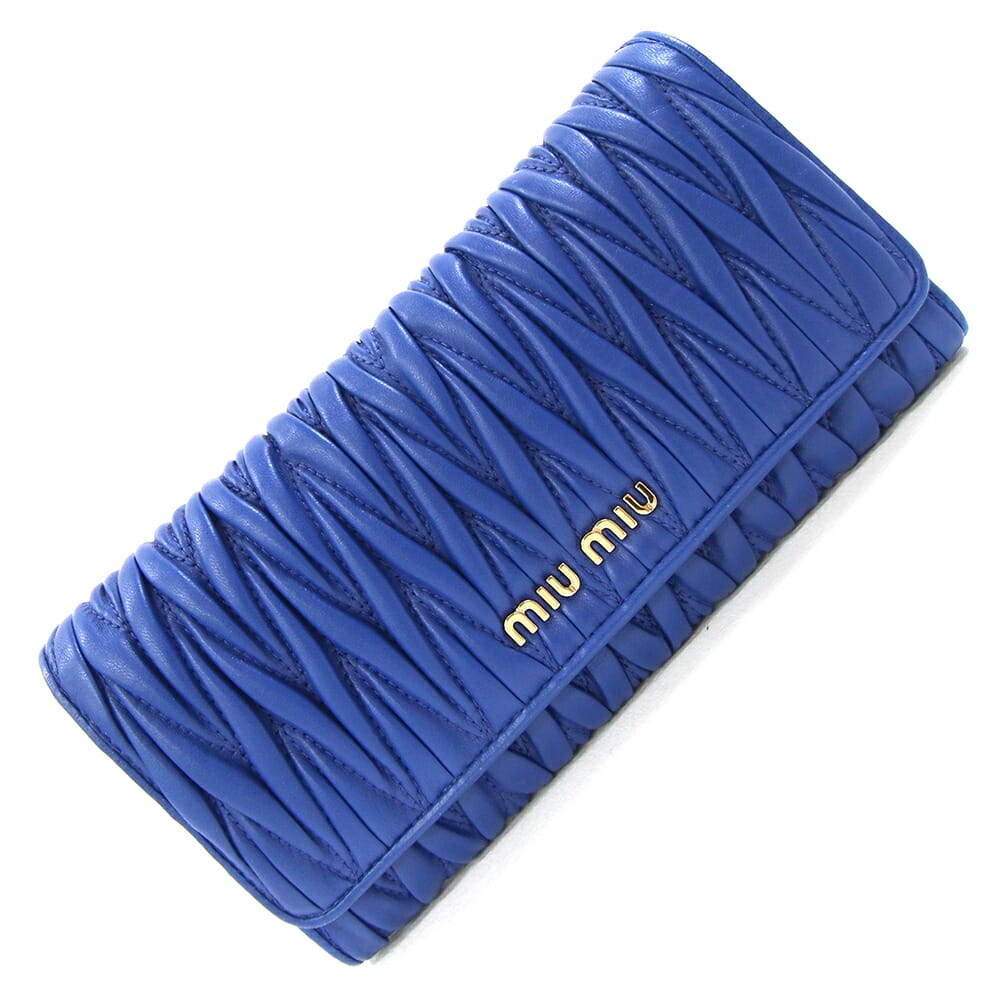 ミュウミュウ 二つ折り長財布 マテラッセ 5MH109 ブルー レザー 中古 ロングウォレット ロゴ ギャザー レディース MIU