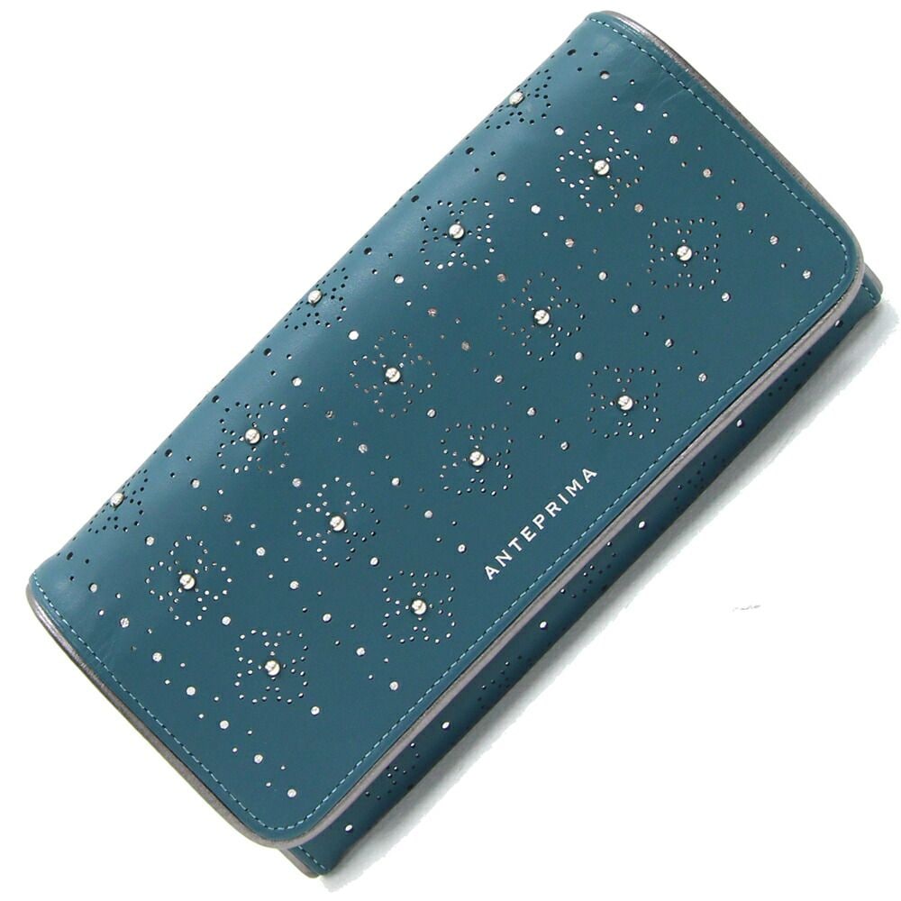 アンテプリマ 二つ折り長財布 グリーン レザー 中古 ロングウォレット 小銭入れ無し 花 フラワー スタッズ パンチング ロゴ レディース
