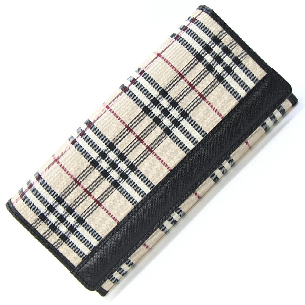 バーバリー 二つ折り長財布 ベージュ ブラック キャンバス レザー 中古 ロングウォレット チェック ロゴ レディース
